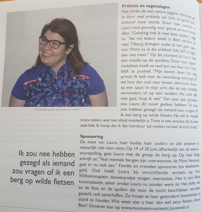 Laura heeft een interview gehad met De uitstraling. Dit is een blad wat in Best huis aan huis verspreid wordt. Hierin vertelt ze over hoe ze de training ervaart en welke dalen ze kent. Maar ook hoe dankbaar ze is voor de hulp.